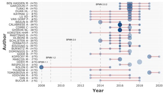 Top 30 authors’ production over time with marked BPMN milestones. The total number of citations by the author is given in parentheses.