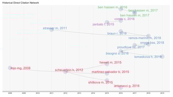 However, if we take the 30 best authors of the given sample, apart from a single author, they all started publishing only after 2013, i.e., only with the BPMN version 2.0. This single author (Rolon et al. []) is one of the externalities, as mentioned above. Another externality (Garcia Rojo et al. []) then became an essential and cited source for younger publications. We report the historical development of citations for 20 records in Figure 7.