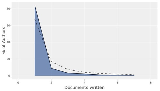 Figure 8 represents the scientometric analysis according to Lotka’s law. Lotka’s law describes the frequency of publication by authors in a given field. In our study, 83.7% of the authors published one publication, and 8.9% of the authors published two publications. Three documents were published by 3.3% of the authors, and 2.3% published four papers, etc.; a maximum of seven publications were published by 0.76% of the authors. The dashed line shows the theoretical distribution according to Lotka’s law.