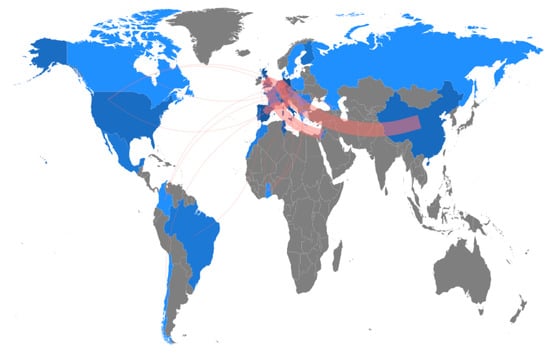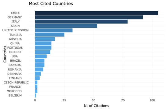 We also analyzed countries by citation and plotted the results in Figure 12. Surprisingly, Chile occupied the first position, but this is because a single article [] received 105 citations. That is the most cited of all documents. Unfortunately, this document has its citations outside the selected papers, and so it was not listed in Figure 7.