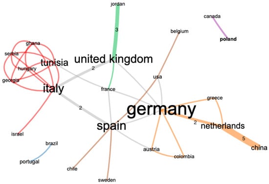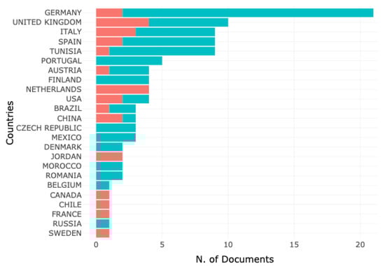The authors of the selected publications are based on almost every continent of the world, as can be seen in Figure 9. In the following paragraph, we list the individual countries and their numbers of documents: 40 documents in Germany, 21 documents in Spain, 19 documents in the UK, 18 documents in Italy and Tunisia, 16 documents in the Netherlands, 13 documents in Brazil, 11 documents in China, 9 documents in Austria and the USA, 8 documents in Jordan and Serbia, 7 documents in Finland, 6 documents in Mexico, 5 documents in the Czech Republic, France, and Romania, 3 documents in Georgia and Russia, 2 documents in Belgium, Canada, Denmark, and Morocco, and 1 document in Chile, Colombia, Ghana, Greece, Hungary, Israel, Poland, and Sweden.