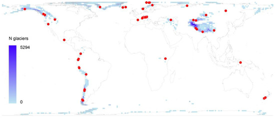 Distribution of glaciers included in the dataset (red dots). Due to proximity, some dots are superimposed. The blue shaded areas show the number of extant glaciers for 1.5° × 1.5° cells (source: [18,19]).