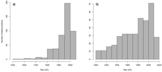 The dataset includes dated margins for 94 glaciers from all the continents except Antarctica (Figure 1). From 2 to 46 past positions are included (average: 7.8 lines per glacier); at least four past positions are shown for 97% of the glaciers. In total, we provide 728 glacier outlines and/or frontal positions for the period from the 16th century to the present. The average length of the time series is 188 years; the length is ≥85 years for 94% of the glaciers. About 97% of the glacier margins date to the period from the 19th century to today, with a marked increase of data over the second half of the 20th century (Figure 2). The oldest outlines are largely restricted to areas where researchers have dated the LIA maximum back to the 16th–18th centuries (e.g., South America [26,27]).