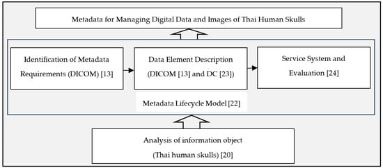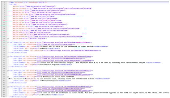 Studies of standard metadata for management of medical information demonstrated a widely known standard, i.e., Digital Imaging and Communications in Medicine (DICOM) [12]. This is an international standard for managing images in medicine and related data that establish the format of data to facilitate exchange of quality data useful for clinical purposes (https://www.dicomstandard.org/about-home, accessed on 2 February 2021). The standard was developed by the National Electrical Manufacturers Association (NEMA). The DICOM standard is composed of four modules: (1) series—explaining a patient’s images; (2) patient—explaining the patient; (3) image—explaining the images in detail; and (4) study—explaining the study or the test conducted with the patient [13]. Tirado-Ramos, Hu, and Lee noted that the DICOM standard is used to manage digital images in medicine. It explains specific information of a real object with the aim of exchanging the information of the objects with similar properties. Therefore, the DICOM standard compiles the characteristics of medical images obtained from CT-Scan, e.g., file name and image characteristics, including size, color, and resolution [13]. However, the DICOM standard cannot be used to manage data related to human physiological or anatomical aspects since it does not provide the management of details related to content. Moreover, other existing metadata standards include the Dublin Core Metadata Element Set [14], used to describe books and documents; the Metadata Object Description Schema (MOD) [15]; the Visual Resource Association (VRA Core) [16], used to describe visual arts, such as paintings, sculptures, and architecture; Categories for the Description of Works of Art (CDWA), used to explain arts, architecture, and cultural objects; and Performance Arts Metadata [17]. It is obvious that the existing metadata standards have been developed to manage different types of information resources, reflecting physical differences, varied content, and user needs [18]. Moreover, none of these standards focus on describing and linking the appropriate semantic data to medical data, especially human skull data, which are used for anatomical and forensic medical studies.