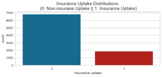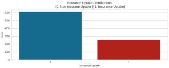 The class imbalance problem arises when the data have a proportion of one class (majority class) significantly higher in than another (minority class). This could be alleviated by various techniques including oversampling of the minority class or undersampling of the majority class to balance both classes []. The Kenya FinAccess Household survey data used in the study, as is commonly the case in real-world settings, were imbalanced to an extent proportionally. Figure 1 shows the data balance proportion for the 2016 Kenya FinAccess Household survey data used. The proportion of those who did not have insurance to those who had it was 6807:1858, which is 3.66:1; hence, the data were unbalanced with the minority class being 21% of the data, while the majority class was 79%. Figure 1 demonstrates the class to some level of imbalance between uptake (the minority class) and non-uptake (the majority class). When the event of interest underrepresented uptake (the minority class), there was a tendency to hinder the classification accuracy. Data imbalance was handled by both upsampling and downsampling.