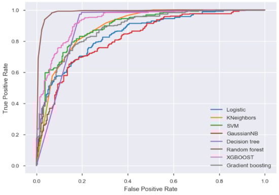 Moreover, Figure 3 shows the areas under the receiver operating characteristics curve (AUCs) for the various models. The AUCs under the various models were: 0.8481 for logistic regression, 0.8914 for the K nearest neighbors classifier, 0.8220 for GNB, 0.8940 for SVM, 0.8962 for DT, 0.9866 for random forest, 0.9300 for XGB (referred to as XGBOOST in the figure), and 0.8823 for GBM. Based on the AUCs, random forest performed best compared to all other models since it gave the highest area under the receiver operating characteristics curve, followed by XGB classifier. This corroborates Blanco et al. [], who found random forest to be a stronger model in the prediction of the efficiency of fullerene derivative based ternary organic solar cells. This implies that ensemble tree based models tend to perform better than others for this kind of data since both random forest and XGB are tree based models and are both ensemble algorithms.