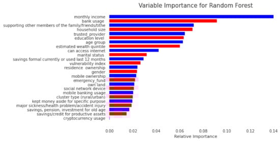 Figure 4 shows the feature importance as extracted from the Phase II analysis. Though bank usage is still an important feature in the prediction of insurance uptake, income has the highest contribution in reducing the weighted Gini impurity, implying that it is the most important feature. Other important factors include the willingness and ability to support others, household size, trusted financial service provider, age, and level of education. Unlike in the Phase I analysis, cryptocurrency usage had a non-zero contribution in the prediction of insurance uptake, though its contribution was least among the variables with non-zero contribution to the insurance uptake.