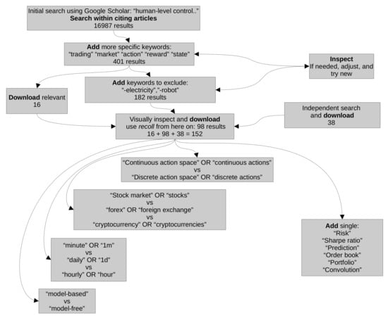 We focus more on the cryptocurrency markets, but without loss of generality, since trading is very similar among financial markets, with the only thing differing being the volatility of assets in each market type, with cryptocurrencies being the most volatile. We do advise the curious reader to take a look at the mentioned works, since they provide different perspectives and plenty of resources to further one’s research. Following [], we take a similar approach to our investigation. We use Google Scholar to search and download all relevant papers (we log in through the respective portal wherever needed using the university subscription), and then we search through them using recoll https://www.lesbonscomptes.com/recoll/, accessed on 8 November 2021 (a free desktop application for advanced searching in documents) to be able to construct the plots in Figure 1 and Figure 2. This is possible for three reasons: