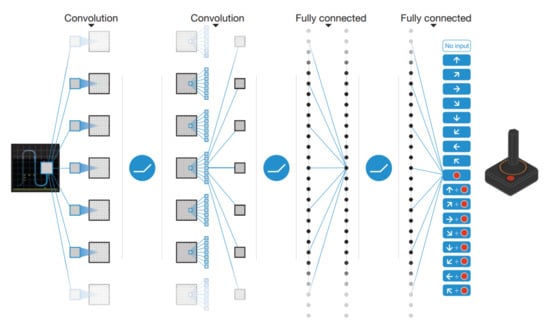 - Mnih, V.; Kavukcuoglu, K.; Silver, D.; Rusu, A.A.; Veness, J.; Bellemare, M.G.; Graves, A.; Riedmiller, M.; Fidjeland, A.K.; Ostrovski, G.; et al. Human-level control through deep reinforcement learning. Nature 2015, 518, 529–533. [Google Scholar] [CrossRef] [PubMed]
