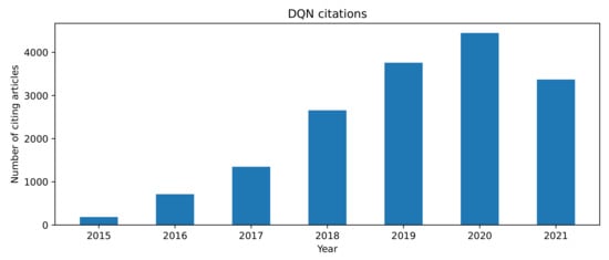 The number of articles citing the original DQN paper. Taken from Google Scholar.