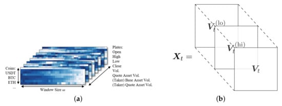As convolutional neural networks (CNNs) were initially successfully used in vision [], they gained popularity throughout the wider ML field: for example, in natural language processing (NLP) [], anomaly detection [], drug discovery https://www.kqed.org/futureofyou/3461/startup-harnesses-supercomputers-to-seek-cures, accessed on 2 October 2021 and many others. Among these, there is also the application to time-series encoding and forecasting []. As we are interested in RL, one way to do it for the state representation of financial time-series is to concatenate the time-series of interest into a tensor, with one axis corresponding to time (usually there are multiple adjacent time-steps fed as a state, the last 5 or last 10 steps) and the other axis corresponding to the different quantities of interest (e.g., open, close, high, low price of a candlestick). We show the graphical representation from [,] in Figure 7.