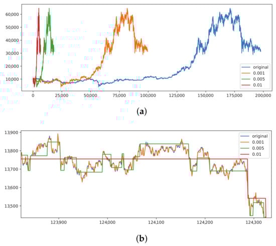 Prediction or forecasting of a time-series is the process of estimating what will happen in the next time period based on what we have seen so far. Will the price go up or down, by how much, and for how long? A comprehensive prediction provides a probability distribution (if it is not a point estimate) of these quantities. Many older works deal with the prediction problem in a financial market, assuming the strategy is clear once the prediction is accurate. It is, indeed, so, but quite often the predictions are not correct, and this can significantly impact the performance of the trading strategy. However, it has been shown that some techniques exist which can predict even quasi-periodic time-series, which is quite remarkable, considering the fundamentally chaotic nature of such time-series [,]. Depending on the nature of the time-series, the prediction interval is generally one time-step, and for each new time-point prediction, the ground truth is fed back to the network. If the prediction is fed such that multiple time-steps are predicted, the prediction degrades rapidly, due to accumulating errors. However, there are some exceptions (see, for example, []). One way to overcome this limitation, is to look at data at a higher granularity (at coarser data). For example, if one looks at minute data (by this, we mean that the prediction machinery is fed with this type of data) to predict 30 min in the future, one needs to predict 30 time-points, whereas if one looks at 30 min data (meaning each point is a summarization of a 30 min time-slice), then there is only need for a one-step prediction. Any strategy built on top of a prediction module is critically dependent on this sampling period. By using multiple different time-scales, one can have a much better picture of the future, especially if the predictions at different levels are combined (for example, using ensembles). Surprisingly, there are not many related works which use such a technique, but there are some [].