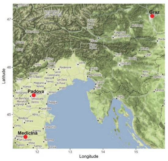 The presented analyses are based on GNSS/Global Positioning System (GPS) observables post-processing and consequent geographical coordinates deviations, as observed and calculated at three IGS Northern Adriatic locations; Graz, Padova, and Medicina [20] (Figure 1 and Table 1, respectively).