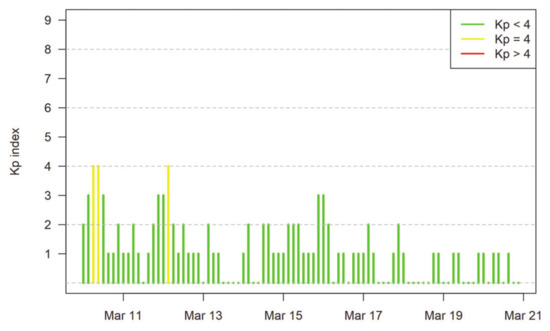 The analyzed period was assessed in terms of geomagnetic activity and, based on the planetary Kp index observables, interpreted as quiet [28,29] (Figure 3).