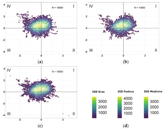 Figure 4. Quadrantal positioning deviation distribution (in m) for IGS Graz (a), IGS Padova (b), and IGS Medicina (c). Scale intensity (d) represents the number of nearest neighbors.