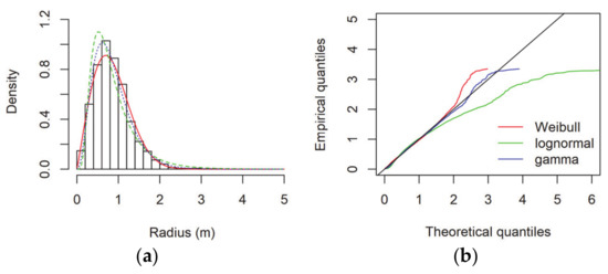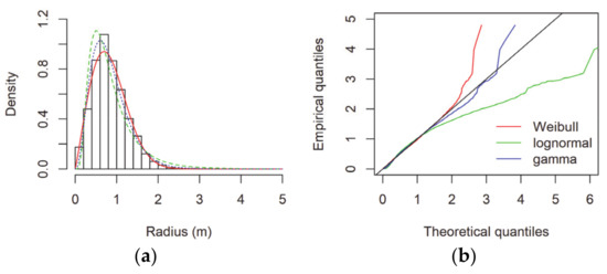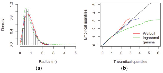 Figure 11. Observed radius magnitude histogram with theoretical densities (a) and Q-Q plot (b) for radius (m) for IGS Padova.