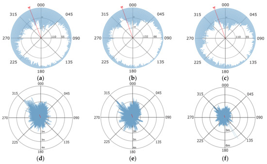 In Figure 13a–c, respectively, in the first row are circular histograms with dots representing counts of azimuths in the observed direction. Likewise, the mean azimuth is depicted as a red arrow line with red dots representing limits of confidence intervals. Figure 13d–f, respectively, in the second row show the deviation vectors with visible red line representing the resultant vector.