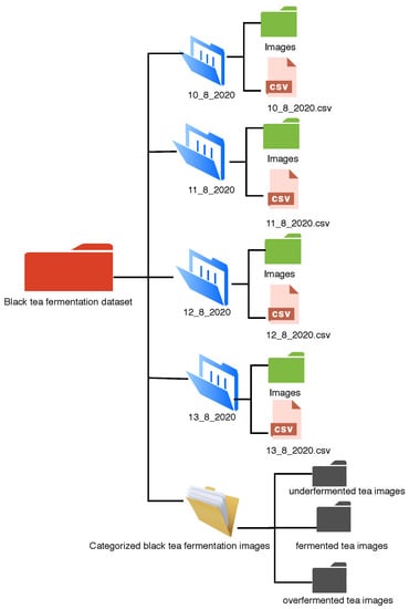 This study releases a black tea fermentation dataset which contains black tea fermentation images and physical parameters of tea during fermentation, which were collected in Sisibo tea factory, Kenya between 10 and 13 August 2020. The dataset can be found here: https://doi.org/10.5281/zenodo.4469326 (accessed on 2 March 2021). The file structure of the dataset is shown in Figure 3.