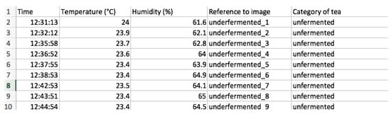 Black tea fermentation conditions are contained in a Comma Delimited Values (CSV) file and contain the fermentation time, temperature, humidity, reference to image and the category of tea (Figure 4).