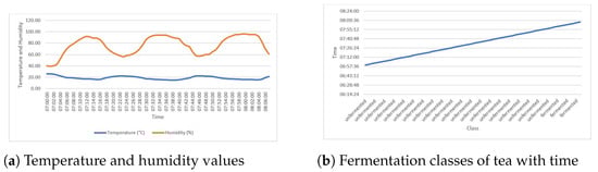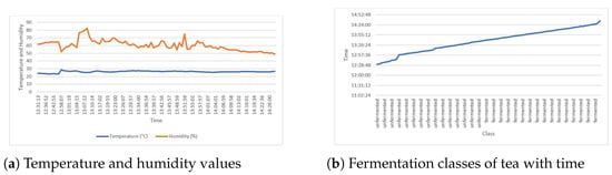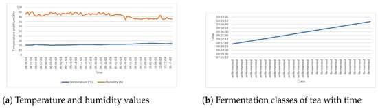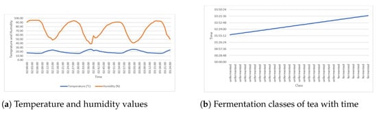 The steps of processing black tea are plucking, withering, crushing, tearing and curling, fermentation, drying, sorting, and packaging []. Among these processes, fermentation is the key determinant of the final quality of the processed tea []. The process is time-bound and must take place within a given temperature and humidity range []. During fermentation processes, tea changes color from green to coppery brown and finally to dark red []. The optimally fermented tea is coppery brown in color, and has a fruity smell and a sweet taste, while the unfermented tea is green in color, and has a grassy smell and a strong taste []. The overfermented tea is dark red and is characterized by a bitter taste []. Currently, the optimum fermentation of tea is monitored manually by tea tasters, adopting the following techniques: monitoring color change, tasting tea as fermentation progresses, and smelling the odor of tea during fermentation []. These manual methods are subjective and lead to a compromise in the quality of the made tea. Image processing and machine learning techniques have shown high levels of ability in various fields, including medicine [], education, E-Commerce [] tourism and banking, among others []. However, for image processing and machine learning to work, there is a need for data for training and evaluation of the models. Worryingly, there is only one reported open-source dataset on tea fermentation images [], which is a limiting phenomenon as researchers have only one dataset to train and evaluate their machine learning models. Therefore, this study aims to resolve this challenge by adopting the Internet of Things (IoT) to capture and release a tea fermentation dataset composed of temperature, humidity, and black tea fermentation images.