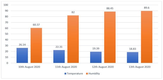 The average temperature and humidity values for the days are presented in Figure 10. The highest average temperature was recorded on 10 August 2020, with 26.14 °C. On 11 August 2020, an average temperature of 22.31 °C was recorded. On the other days, the average temperatures were 19.39 °C and 18.83 °C for 12 August 2020 and 3 August 2020, respectively. Thus, the fermentation took place outside the range of 20–30 °C for the two days.