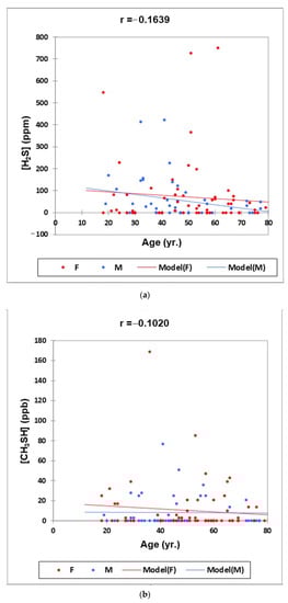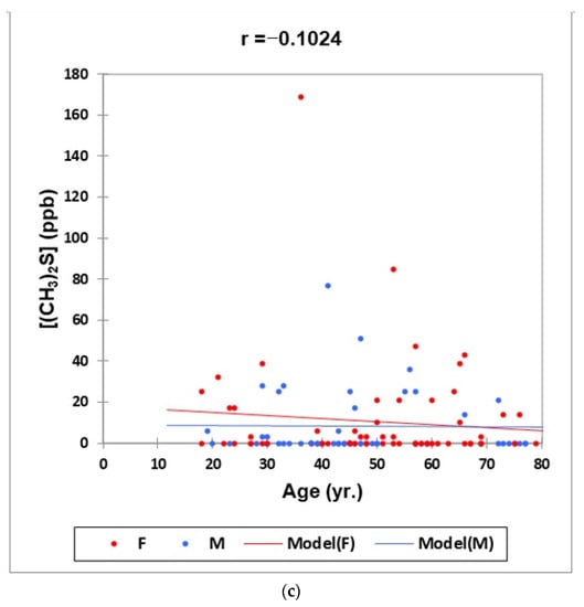 - Figure 1: Plots of (a) H2S, (b) CH3SH and (c) (CH3)2S oral cavity air concentrations versus participant age for females (red) and males (blue) for the outlier-free dataset (n = 114). Correlation coefficient (r) values for these relationships are also provided.