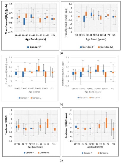 - Figure 2: Plots of least squares mean ± 95% confidence intervals (CIs) for glog-transformed and autoscaled oral cavity concentrations of (a) H2S, (b) CH3SH and (c) (CH3)2S for each age band and gender featured in the analysis-of-variance-based experimental design applied (results obtained both before and after the removal of n = 2 possible outlier participant samples are shown).