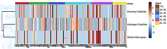 A monoclustering heatmap diagram for the each of the different study age-bands is shown in Figure 3, with both up- and downregulated VSC levels indicated for all participants recruited to the study. Clearly, no ‘between-age band’ differences between VSC concentrations are visible in this diagram. However, application of the AHC technique to these data provided evidence for the division of the VSC potential predictor variables into two clusters, one consisting of a combination of H2S and CH3SH, the second with (CH3)2S alone. In view of this, this clustering of these VSC variables was further explored using a range of further MV and clustering analysis techniques (Section 2.3.5 and Section 2.3.7).