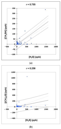 Hence, on considering study timelines, it would appear that the pre-breakfast samples collected during the reference investigation reported in [] probably best approximates those collected in the current study, and mean levels determined in these were about 50, 40 and 20 ppb for H2S, CH3SH and (CH3)2S, respectively. These values certainly do not differ significantly from those found in the current study, in datasets both with and without outlier sample inclusion. Ref. [] also found that H2S levels were very significantly correlated with those of CH3SH (r = 0.65), but not between (CH3)2S concentration and either H2S or CH3SH. Hence, these results are entirely consistent with those found in our study (corresponding r value 0.755, Table 2).