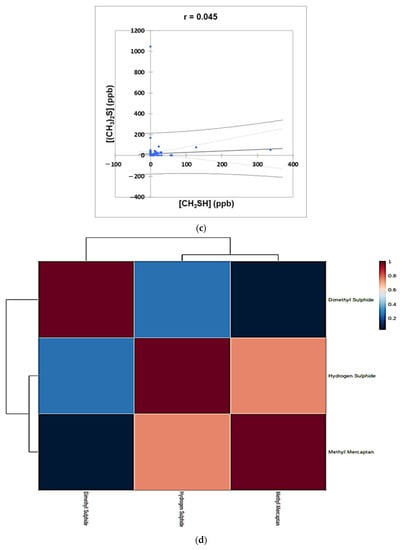 Plots showing results from the regressions of CH3SH on H2S, (CH3)2S on H2S and (CH3)2S on CH3SH are shown in Figure 4a–c respectively. Clearly, there is a strong linear correlation between CH3SH and H2S (r = 0.755, p ≤ 10−21), but only a weak, albeit still statistically significant relationship between (CH3)2S and H2S (r = 0.258, p < 0.006); that between (CH3)2S and CH3SH concentrations (r = 0.045) was not significant. This is confirmed by the correlation heatmap shown (Figure 4d), which also shows two correlation-based clusterings containing (1) a composite of CH3SH and H2S, and (2) (CH3)2S alone. This again provides evidence for differential physiological site sources of these VSC clusters. A corresponding correlation matrix is displayed in Table 2. Both Pearson and partial correlation coefficients are listed therein.