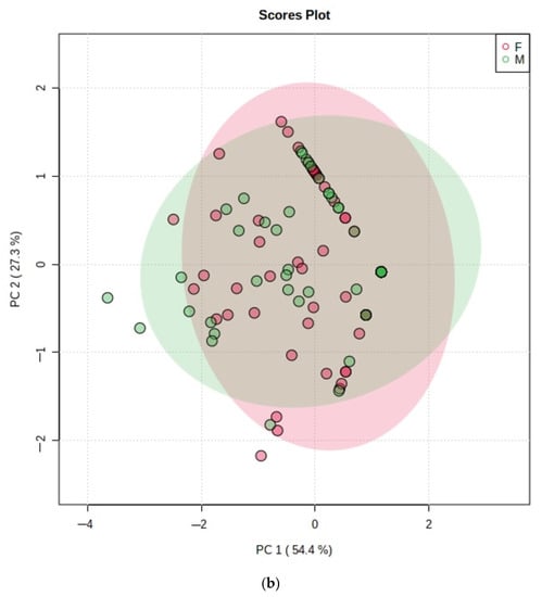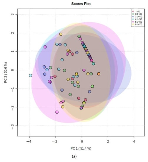 PCA and PLS-DA scores plots confirmed that there were no significant MV distinctions between any age bands, nor between gender classifications—PCA scores plots for the investigation of possible differences between different age bands and genders are shown in Figure 5a,b respectively. PLS-DA Q2 values of −0.04 and −0.35 were found for 2-component models considering age bands and genders as qualitative output factor classifications respectively (a value of +0.50 serves as a threshold cut-off value for an acceptable level of predictive classification success). Similarly, OPLS-DA also demonstrated that VSC concentration variables did not offer any ability to distinguish between participant age bands and genders. Likewise, both PLS-R and PCR analyses, with ages and gender scores as quantitative response variables, confirmed that none of the three VSC variables, nor the 2 components arising therefrom, served as significant features for predicting participant ages or gender scores.