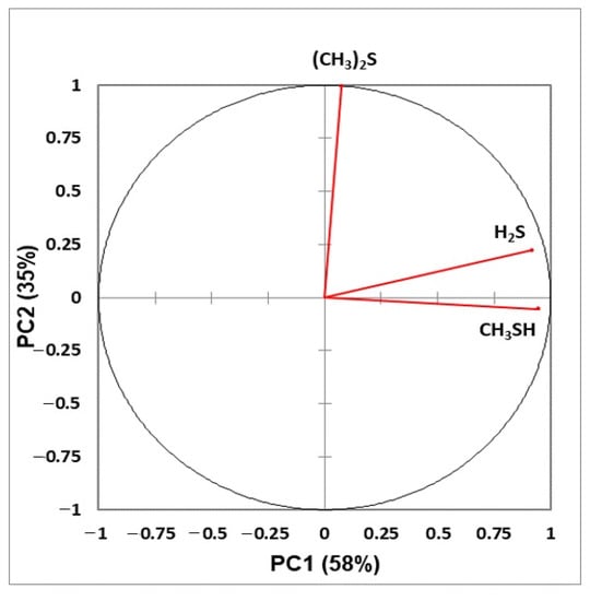 Notwithstanding this, PCA demonstrated that the 3 VSC variables were effectively segregated into two clear orthogonal components, the first containing a linear combination of H2S and CH3SH (loading vectors 0.92 and 0.95 respectively), the second (CH3)2S alone (loading vector 0.99), as shown in Figure 6 and Table 3. The PC loadings vectors of variables represent their degree of correlation with specific PCs; values of these which are lower or greater than the threshold values of −0.40 (for negative correlations with that PC) or +0.40 (for positive correlations with that PC), respectively, are generally accepted as ‘cut-off’ thresholds for significance.