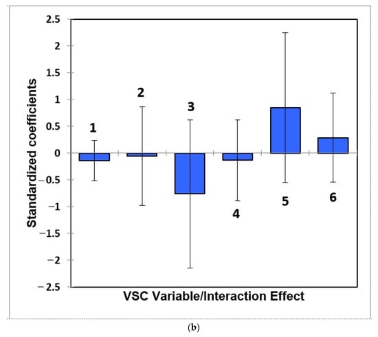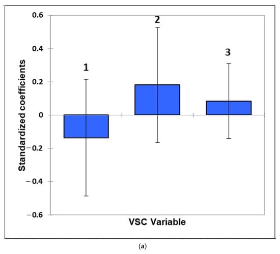 Subsequently, logistic regression analysis (logRA) was applied as an alternative protocol in an attempt to predict age bands and gender scores of participants. Models were developed both with and without the consideration of VSC interaction effects, and also the use of a PCR-logistic regression variant (logPCR) for the binary gender score variable. However, all forms of logRA were completely ineffective in predicting the multinomial gender age band variable, and both this and the logPCR approach were unsuccessful in distinguishing the binary gender score variable. Indeed, overall classification success rates were only 26.4% and 27.4% for the logRA technique applied to age bands without and with the inclusion of first-order VSC interaction effects, respectively, Moreover, corresponding success rates for binary gender score classification were only 48.3% and 50.0%. Bar diagrams of standardized coefficients for VSCs and their corresponding 95% CIs for gender score prediction models, with and without the incorporation of second-order interaction effects, are shown in Figure 7. Clearly, none of the VSC variables were found to contribute towards gender score variances significantly.
