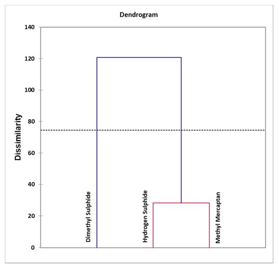 Agglomerative hierarchal clustering (AHC) dendogram of VSC variables revealing clear distinctions between clusters arising from an orally-sourced combination of correlated oral cavity H2S and CH3SH levels, and that of uncorrelated (orthogonal) extra-oral (CH3)2S. The AHC model involved a consideration of maximum dissimilarities from Euclidean distances, and a computed two-factor model was found to represent the most significant and effective one. The dissimilarity threshold limit (horizontal broken line) was determined via an automatic entropy truncation method, and this confirmed a clear distinction between the H2S/CH3SH composite cluster and that of (CH3)2S. The dataset analysed was autoscaled prior to analysis.