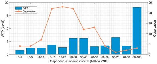Concerning the relationship between residents’ financial status and contribution levels, Figure 1 illustrates the willingness to pay associated with the income intervals of 117 inhabitants who explicitly expressed their positive contributions to the air protection fund and were willing to share information about their disposable income. The literature shows that there is a positive correlation between income and WTP [22,23,24]. Our results are no exception. Figure 1 describes that higher-income groups generally tend to offer larger financial commitments to improve air quality than the lower-income groups. In fact, the three groups with the smallest WTP values are those with the lowest monthly income.