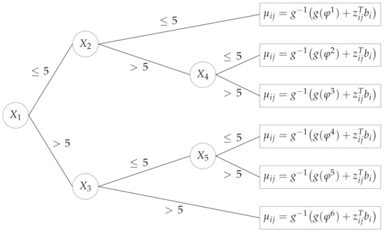Let us define the fixed-effect structure. Eight random variables , independent and uniformly distributed in the interval , were generated. While all of them were being used as predictors, only five of them were actually used to generate , based on the tree rule summarised in Figure 1. Each observation was classified into one of the six terminal nodes according to the values . Within each leaf, values denote the probabilities of success when the random effects are equal to zero: