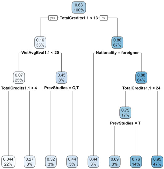 - Yasmin, D. Application of the classification tree model in predicting learner dropout behaviour in open and distance learning. Distance Educ. 2013, 34, 218–231. [Google Scholar] [CrossRef]