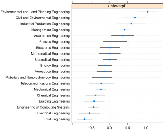 Using the tree structure in Figure 2, we could get population-level predictions for new observations that did not include the effect of the programme. However, if we also specified the level of the random effect covariate, our model was able to adjust this prediction to account for the effect and make a group-specific prediction. Indeed, we extracted coefficients from the full estimated mixed model (3) and provide different predictions for different programmes within each leaf of the tree structure. Figure 3 shows the ranking of the 19 estimated random-effects intercepts, one for each degree program. Light blue points correspond to the point estimates , for , and the horizontal black lines represent the confidence intervals of the estimates. When the confidence interval does not overlap with 0 (identified by the dashed vertical line), we have evidence to assert that the degree program’s effect was significantly different from zero, i.e., from the average. For many groups, the 95% confidence interval does not overlap with the vertical line at zero, underlining substantial differences between the groups. If we use this model to estimate the probability of graduation, many degree programs will give results significantly different from the average. In particular, degree programs whose confidence intervals are entirely higher (lower) than zero are associated with higher (lower) dropout likelihood with respect to the average, all else being equal. After fixing all other covariates, Environmental and Land Planning Engineering and Civil and Environmental Engineering had large positive effects on the intercept: one student from one of those programmes improves the log odds by or , respectively. On the contrary, studying either Civil Engineering or Electrical Engineering penalises the log odds by and respectively.