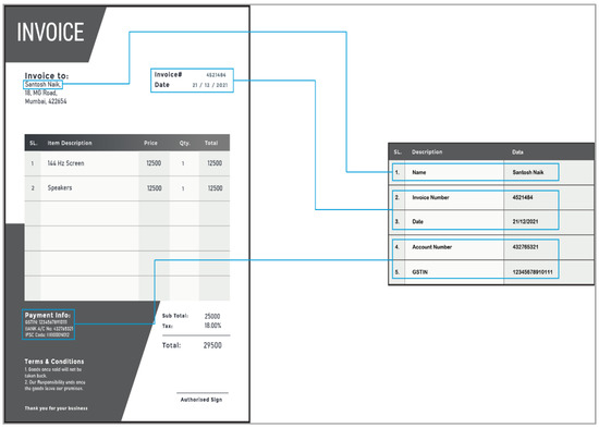 Due to these challenges, a few research studies proposed a custom dataset. However, the custom datasets are private and face confidentiality issues [4,14]. The custom dataset also includes documents with similar layouts or formats. Providing similar layout documents restricts the generalizability of key extraction tasks. Few recent studies highlight the significance of the template-free processing of unstructured documents [15,16]. Therefore, to encourage and advance automatic key information extraction research, we developed a dataset. Figure 1 shows an overview of key information extraction tasks from the invoice document. Our multi-layout invoice document dataset (MIDD) dataset contains 630 invoices with four different layouts of different suppliers. The dataset is of high-quality document images, which leads to high accuracy in text extraction. The dataset also helps to generalize the AI-enabled model as it comprises varied and complex layouts of documents. Table 1 summarizes our MIDD dataset specifications.