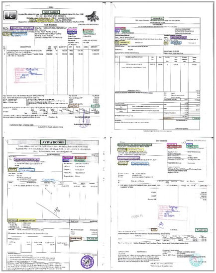 Figure 3 shows the sample invoices of all four different layouts from our dataset. Different key fields are colored with different colors to understand the meaning of “different layouts of invoices.” For example, the invoice number key field shown with the green rectangular surround box is positioned at different locations in all four layouts of invoices collected from different suppliers. Likewise, all other invoice key fields take a different position as the supplier organization changes. Thus, our dataset is useful for dealing with a real-world situation where organizations have their own unique format or layout of unstructured documents.