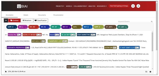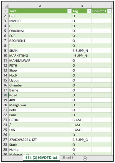 Converted text files are manually annotated. UBIAI is a convenient and simple-to-use text labeling/annotation tool used for most Natural Language Processing (NLP) tasks such as named entity recognition (NER). By selecting the “free version” of the UBIAI package under the “Package” option, all decided labels for invoice entities ( for example, INV_L for invoice label and INV_DT for actual Invoice Date value) to annotate the invoice document are supplied through its interface manually. After providing labels, the converted text files are inputted manually either by the “drag and drop” facility or the “browse” facility of the UBIAI interface. After all the text files are inputted, they can be annotated by choosing labels individually and highlighting the respective text within a complete text file, as shown in Figure 4. This also provides an annotation file export facility in multiple formats such as spacy, IOB, and JSON. As shown in Figure 2, the text files obtained after OCR are provided to UBIAI with the labels to be annotated. Table 2 shows the name of the labels used to annotate the text files. Finally, the annotated text file of each invoice in IOB format is exported. IOB labels are like part-of-speech (POS) labels, but they signify the inside, outside and beginning of a word. In NER, every word in the text file, also called “token,” is labeled with an IOB label, and then adjacent tokens are joined together depending on their labels. Later IOB files are transformed into a .csv file. Figure 5 shows the sample IOB file of the invoice. The first column represents the “token,” and the second column represents the IOB tags of the respective tokens.