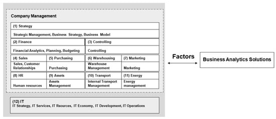 Business analytics is applied in various fields of company management based on various functionalities and various effects, focused on various stakeholders and thus respecting various impact factors. Various fields of company management include the individual topics of business management. The basic relationships of management fields—factors—business analytics are documented in