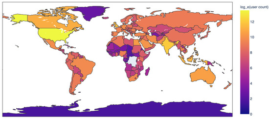 Eventually, a total of 96.2% of user locations were detected. As 3.7% of users had an empty location field, this means that only a tiny fraction of users did not have a usable location that could be mapped to a country. Figure 3 shows the distribution of these locations across the world. We can see that U.S.-based (711,889 users, making up 38% of the users in our dataset) and India-based (163,521 users, making up 8.7% of the users in our dataset) users make up a large proportion of our dataset.