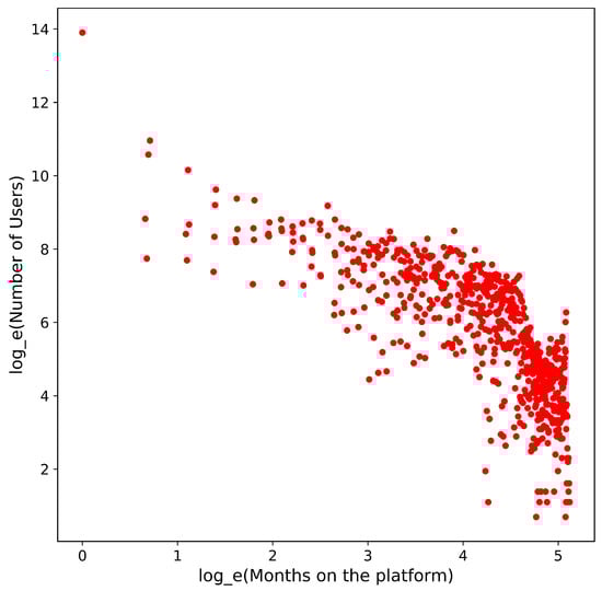 Distribution of the number of months the user was active on the website. The values displayed on both axes are on the natural logarithm scale.