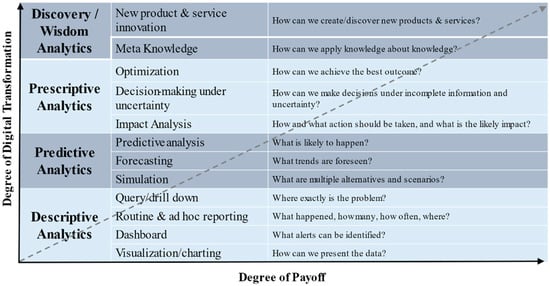 Businesses in the past have mostly applied descriptive analytics towards their cases. Managers have utilized query and reporting tools to gather historical performance data and classify and categorize data that is typically structured [,]. Now, with data warehouses, disparate data can be merged and dashboards, and customer views and repositories created. Business entities can build on the functionalities of descriptive analytics to move on to predictive analytics, to forecast future events using what-if analyses and models []. Soon, these same entities will utilize prescriptive analytics that can help in forecasting, as well as proactive decision-making. Prescriptive analytics includes recommended actions as well. To descriptive, predictive, and prescriptive analytics we add the term discovery or wisdom analytics, the next frontier in analytics, which will help businesses identify new markets, products, and strategies. Figure 1 highlights aspects of the four types of analytics. On a continuum, businesses would progress from the routine application of analytics (e.g., visualization) to more advanced applications such as artificial intelligence and deep learning (e.g., prescriptive/discovery analytics), although the four types of analytics share some of the features. As businesses move through efficient digital transformation, analytics would result in higher payoff as data-driven decisions drive performance [,,]. For example, businesses may use dashboards and scorecards to evaluate performance through key performance indicators. Analytics applications, particularly role-based performance analytic applications, allow different views of data depending on a user’s role within a business. This facilitates individual decision-making to be aligned with corporate strategy [,].