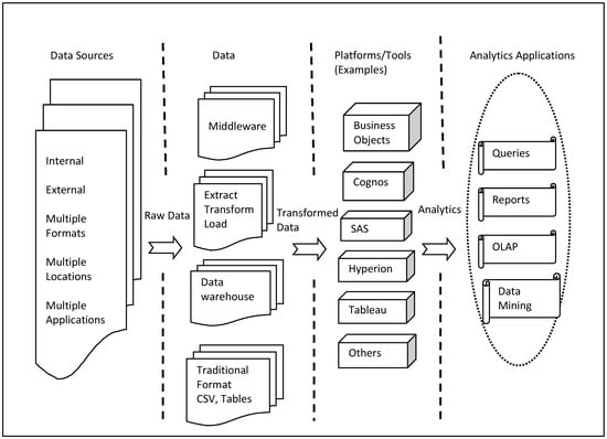 Figure 2 provides the architectural framework of business analytics. It depicts the various components and how they interact to enable analytics [,]. The framework contains four key elements.