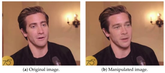 Several works have already processed a compound dataset [3], namely by compiling photos available in CelebA-HQ dataset [11], Flickr-Faces-HQ dataset [12], “100K Faces project” (https://generated.photos, accessed on 4 August 2021) and “this person does not exist” project (https://thispersondoesnotexist.com, accessed on 4 August 2021). The datasets described on Table 1 were tested and benchmarked individually in a wide set of published research works [2,3,4,8]. Notwithstanding the richness of the published datasets, some of them only have deepfake-based manipulations examples. To overcome this limitation, datasets with distinct manipulations types, such as copy-move, were added. To do this, additional datasets that contain not only faces but also everyday objects were added. COVERAGE dataset [15] is a copy-move forgery database with similar but genuine objects that contains 97 legitimate photos and 97 manipulated ones.
