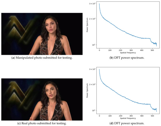 Figure 4 illustrates a manipulated photo (Figure 4a) and its original version (Figure 4c), as well as the corresponding power spectrum obtained by DFT method described on Section 1 (Figure 4b,d). It is possible to identify the variations of the power spectrum between both photos.