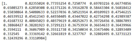Figure 5 illustrates an entry of the resulting uni-dimensional vector. Each entry starts with the classification label, followed by a list of numeric values, which corresponds to the features extracted from the photo through DFT. The label can have two values, namely 0 and 1, which correspond to a genuine or manipulated photo, respectively. The following values are obtained applying an azimuthal averaging to compute a robust one-dimensional representation of the DFT power spectrum. It can be seen as a compression, gathering and averaging similar frequency components into a vector of features.