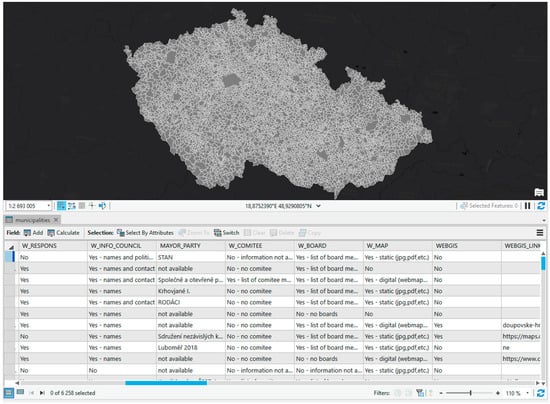 The final dataset is in a vector format using polygons as a geometric representation of administrative boundaries with attached data from the survey. The coordinate system set for the data is S-JTSK_Krovak_East_North (EPSG code 5514). Attributes are based on the questions from the survey (Table 1), but in some cases, answers on survey questions were decomposed for better manipulation (analysis and visualization) in GIS. Moreover, besides fundamental identifiers of municipalities (unique ID codes, municipalities’ names, higher hierarchical units codes, and names), we added a synthetic index—Index of GeoParticipation—derived from primarily collected data from the survey (see more in the methodology section). The list of attributes with their meaning is in Table 2, and the data view in ArcGIS Pro environment in Figure 1.